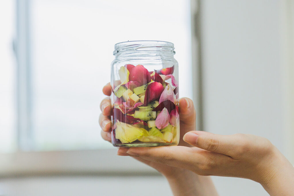 ③バラの花びら→リンゴ→キウイの順で瓶に詰めていきます。ふわっと入れていくのがポイント!