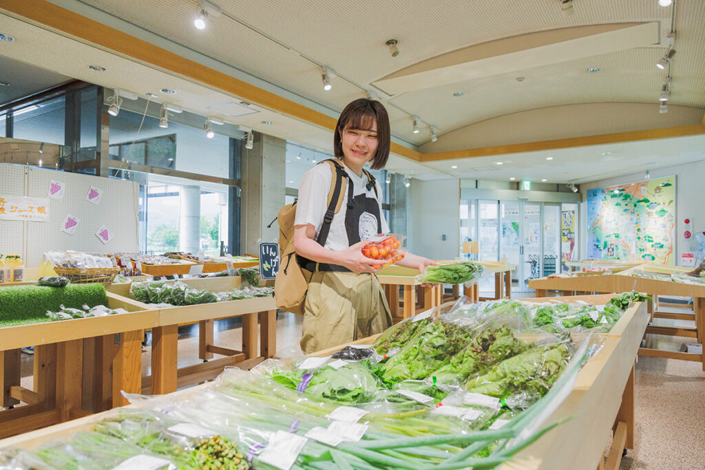 サクランボや野菜、お土産など、地元の特産品が勢ぞろい。私もお土産にサクランボをゲットしました!