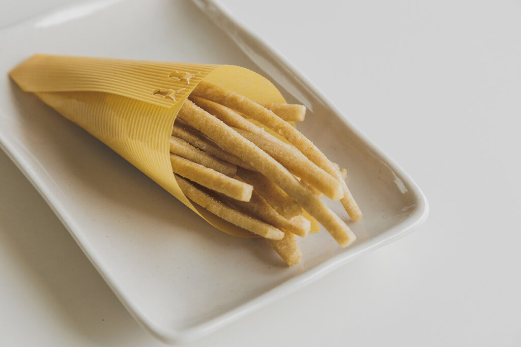「かいもづスティック」350円。そば粉をお湯で練った「そばがき」を油で揚げた看板商品。外はカリカリ、中はもちもち。程よい塩味もあり、これはクセになりそう…!