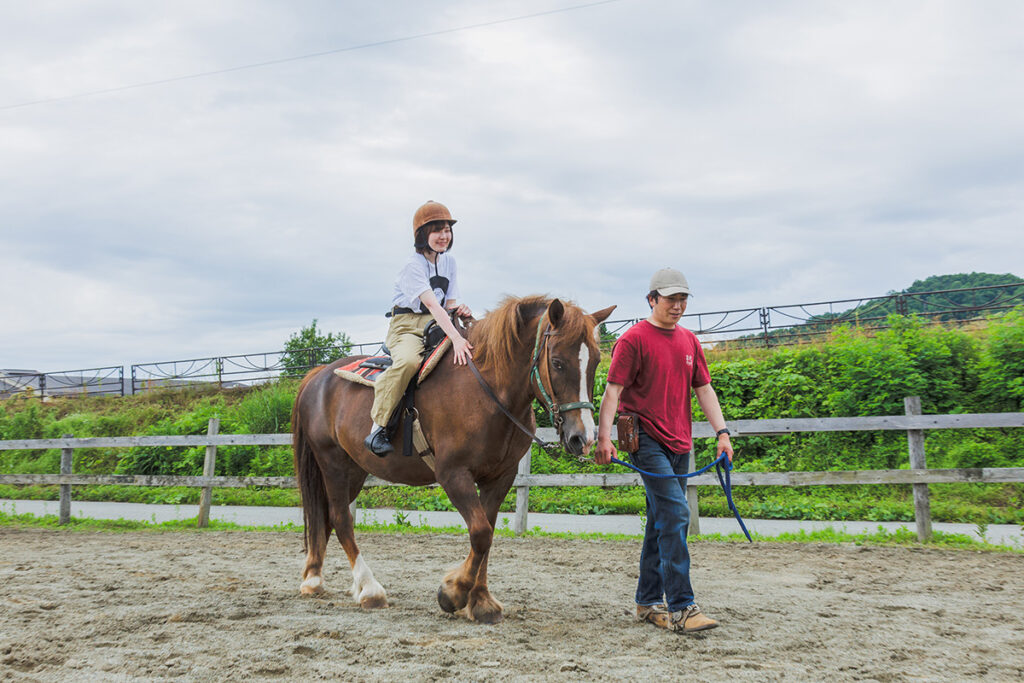 インストラクターの庄司さんに教えていただきながら乗馬に挑戦!今回私を乗せてくれたのは、リリーちゃん17歳。穏やかな性格で、初心者を乗せるのにぴったりなお馬さんなのだとか