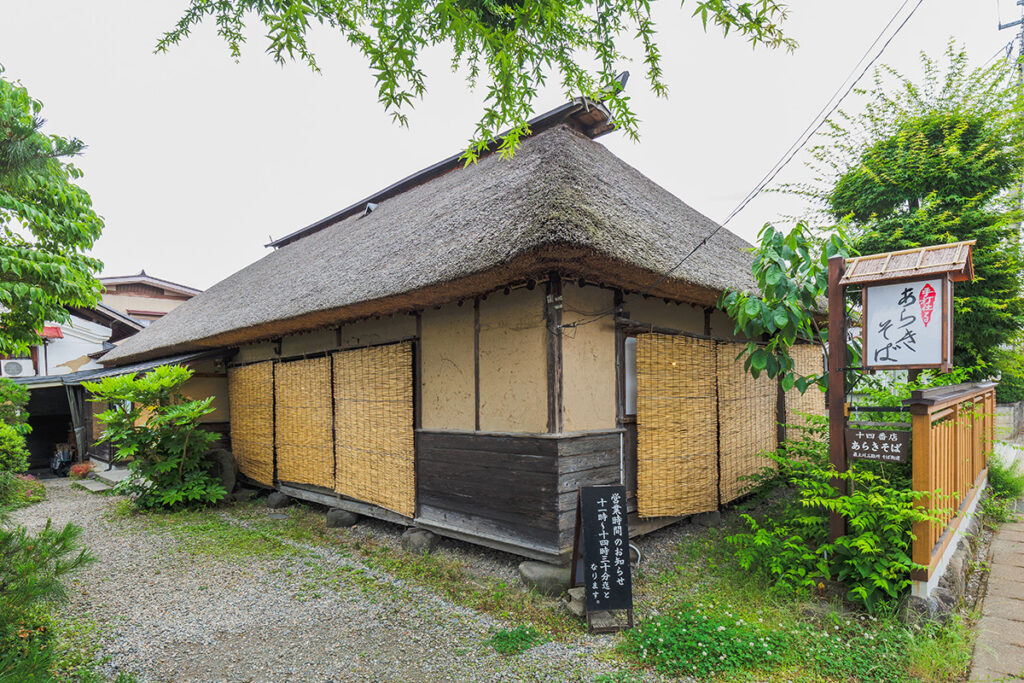 『あらきそば』は1920年開業の山形を代表する蕎麦の名店。かやぶき屋根が特徴的なお店は、築200年以上になる農家建築