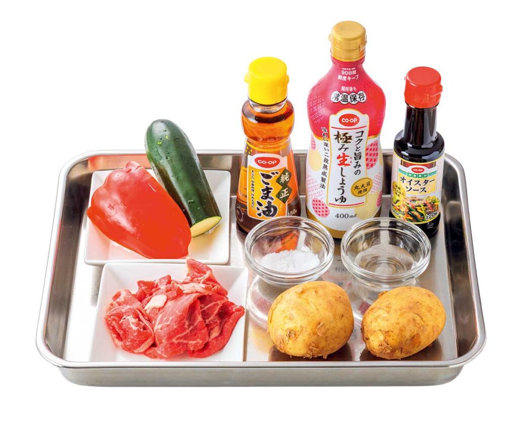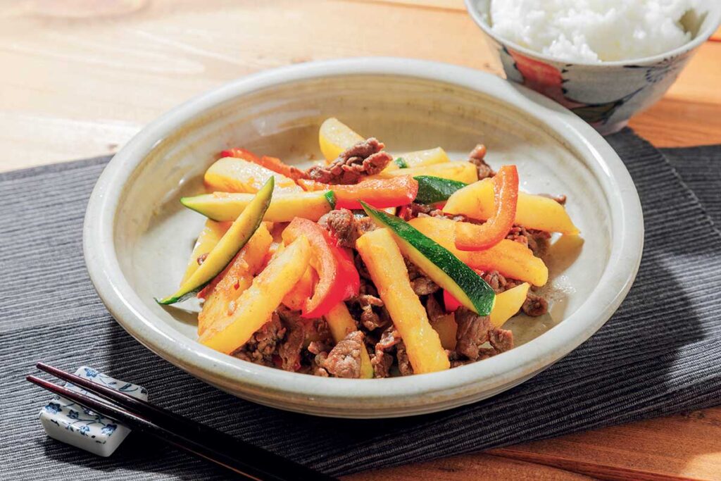 ❹フライパンにサラダ油を熱し、水気を切ったじゃがいもを入れて中火で透き通るまで炒める。じゃがいもが透き通ってきたら、牛肉、ズッキーニ、パプリカを加えて炒める。油が回ったら強火にしてAを回しかけ、味がなじんで水分がなくなってきたら最後にごま油を回しかけて完成。