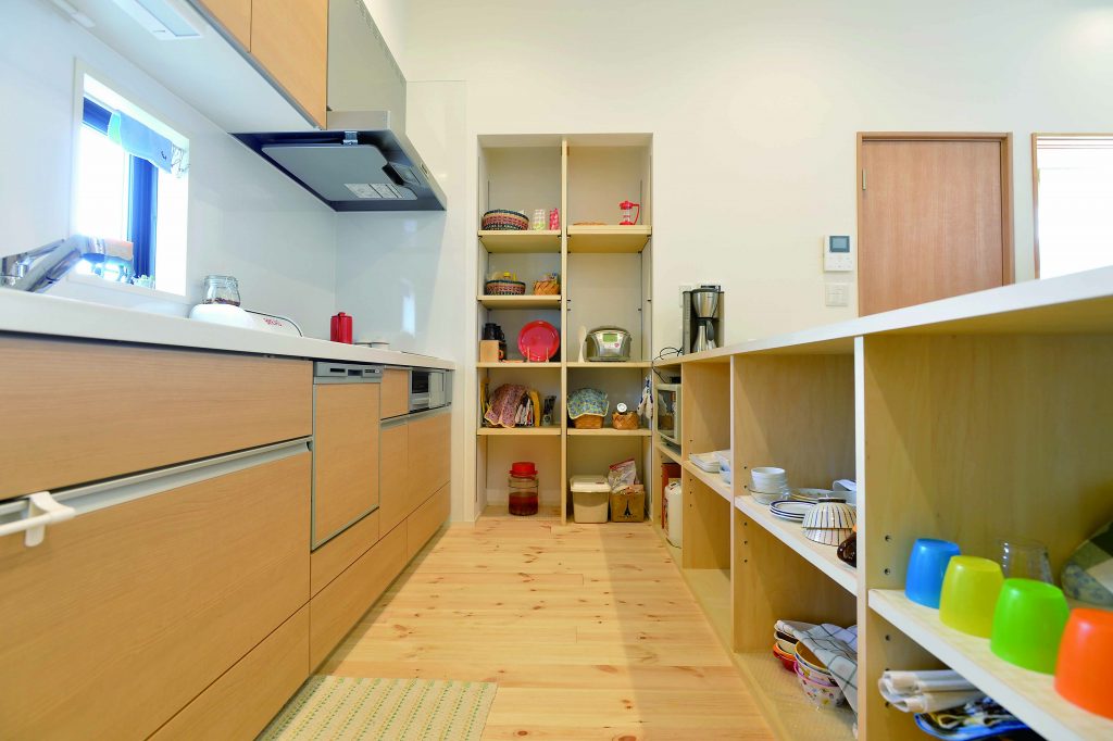キッチンに大きな作業カウンターが欲しいとのリクエスト。広いだけでなく週のスペースもバッチリ!