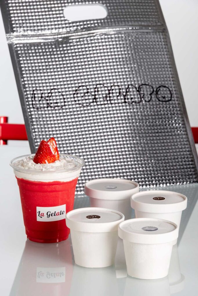 持ち帰り用カップジェラート(各500円)。好きなフレーバーを選べる「ジェラートシェイク」(700円)は運転しながらでも片手でジェラートが楽しめちゃいます
