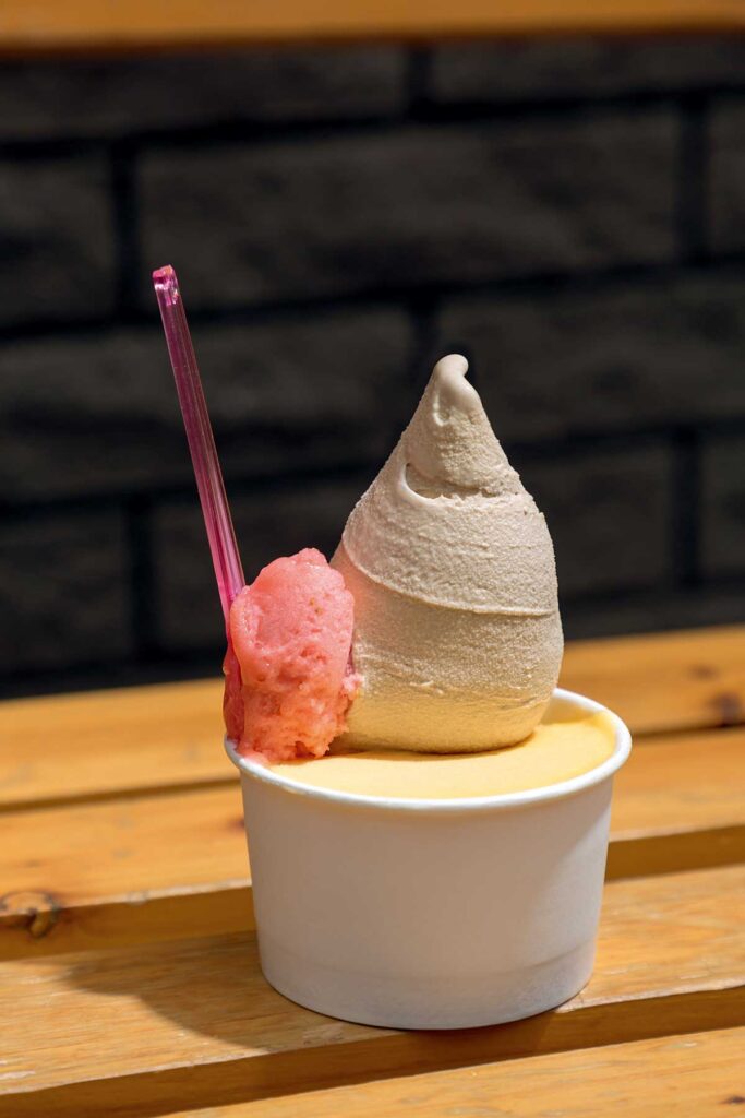 蔵王山麓の自然に囲まれた「牧場カフェ醍醐」では、自家牧場で搾ったばかりの生乳で仕立てたフレッシュなソフトジェラートを提供しています。定番の「ミルク」や「塩」に加え、「大吟醸」「ラムレーズン」「梅酒」、ニッカウヰスキー「伊達」を使った「ウイスキー」といったお酒を材料にした個性的な味もラインナップ。カップからこぼれ落ちそうなほどボリューミーで、思う存分味わえるのもうれしいポイントです。