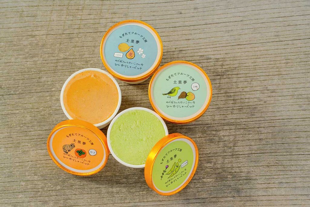 桃農家である店主の熊谷さんが、栗原の果物や野菜で手作りするシャーベットのお店です。季節限定を含め25種類ものフレーバーがあり、中にはガマズミやナツハゼ、サルナシなど、里山に自生する果実を自ら採取して作るフレーバーも。乳製品は一切加えず、使うのは素材と砂糖と甘味料のみ。太陽の恵みがそのまま凝縮されたような、野趣あふれる甘酸っぱい味わいを召し上がれ。隣接のそば処では熊谷さんの手打ちそばも!