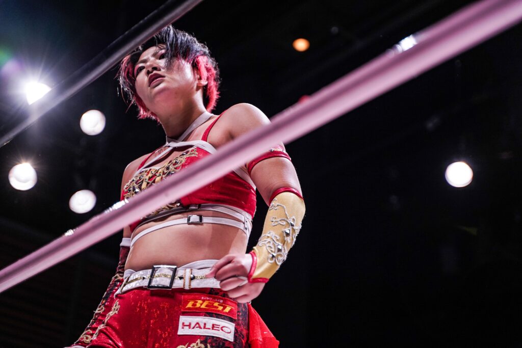 (プロフィール)YUNA(ユナ)。宮城県大河原町出身の21歳。2023年8月9日デビュー。写真が趣味で、仙女所属選手のポートレート写真を撮影することも。得意技は「ドロップキック」「ミサイルキック」。