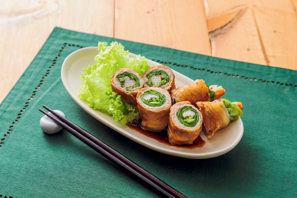 ❶豚バラスライスを2枚並べる。レタス2枚をかにかまぼこを芯にして巻き(※1)、さらに豚バラスライスにのせてクルクルと巻いたものを4個作る。