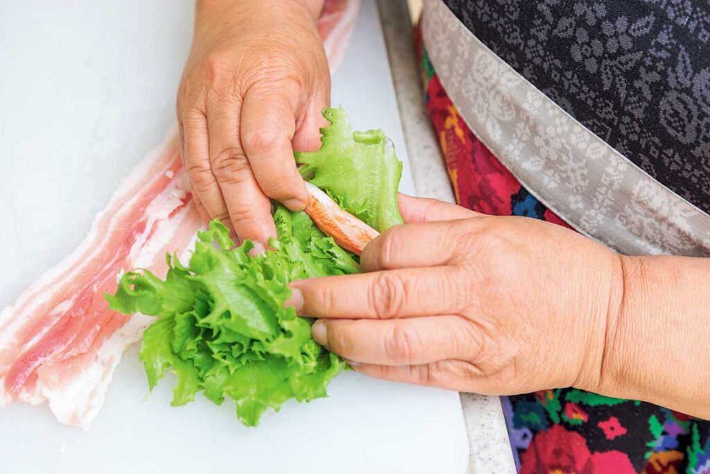 (※1)かにかまぼこをフリルレタスにのせて隙間なくギュッと巻き込むことで、肉を巻いた後も崩れにくくなります