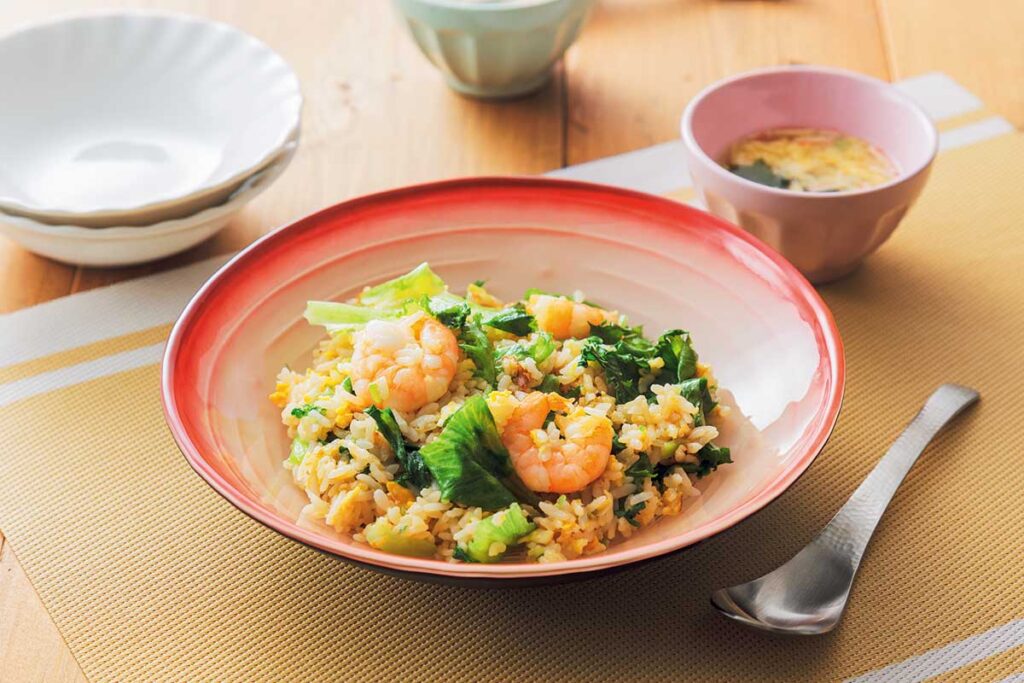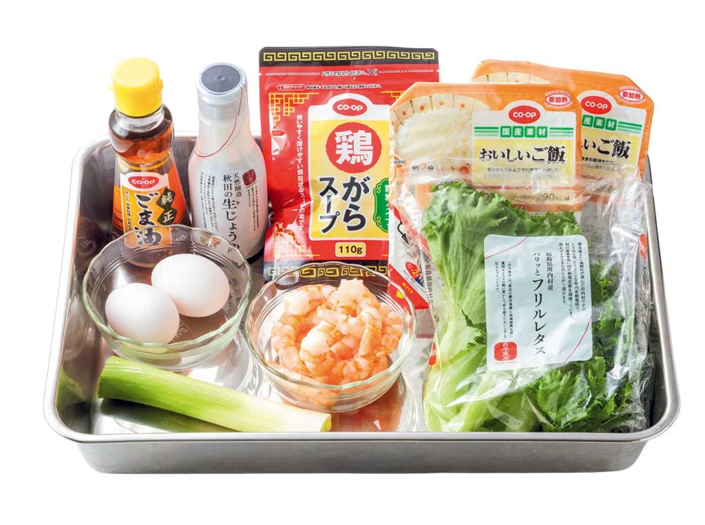 ❷フライパンでごま油を熱し、えびを炒め、次に溶き卵と長ねぎ、ご飯も入れて炒める(※1)。鶏ガラスープ、醤油を加えさらに炒める。