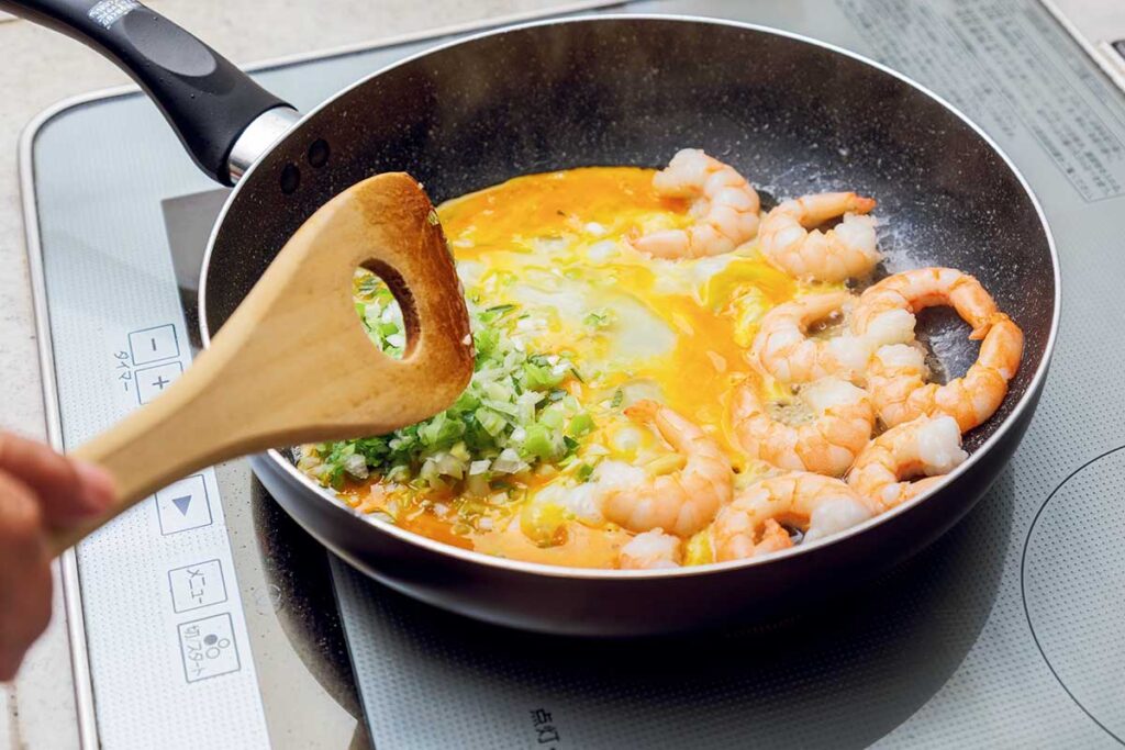 (※1)えびを炒めたらレタス以外の食材を投入して、溶き卵とご飯をしっかり混ぜ合わせます