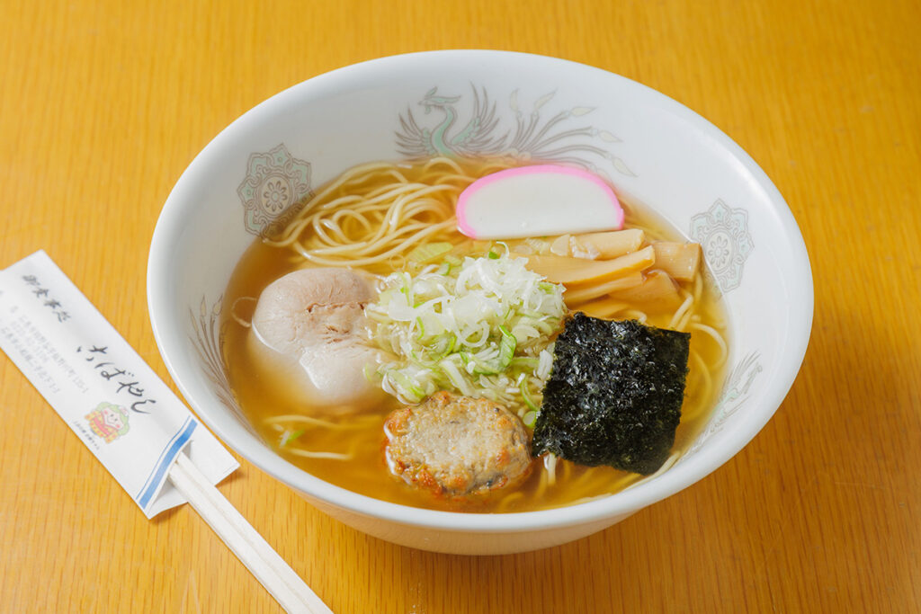 湯上がりには、併設の『食事処こばやし』で地元食材を使った料理を味わうのもおすすめ。中でも「サバだしラーメン」(900円)は、豊かな風味と滋味深い味わいで人気の逸品です。