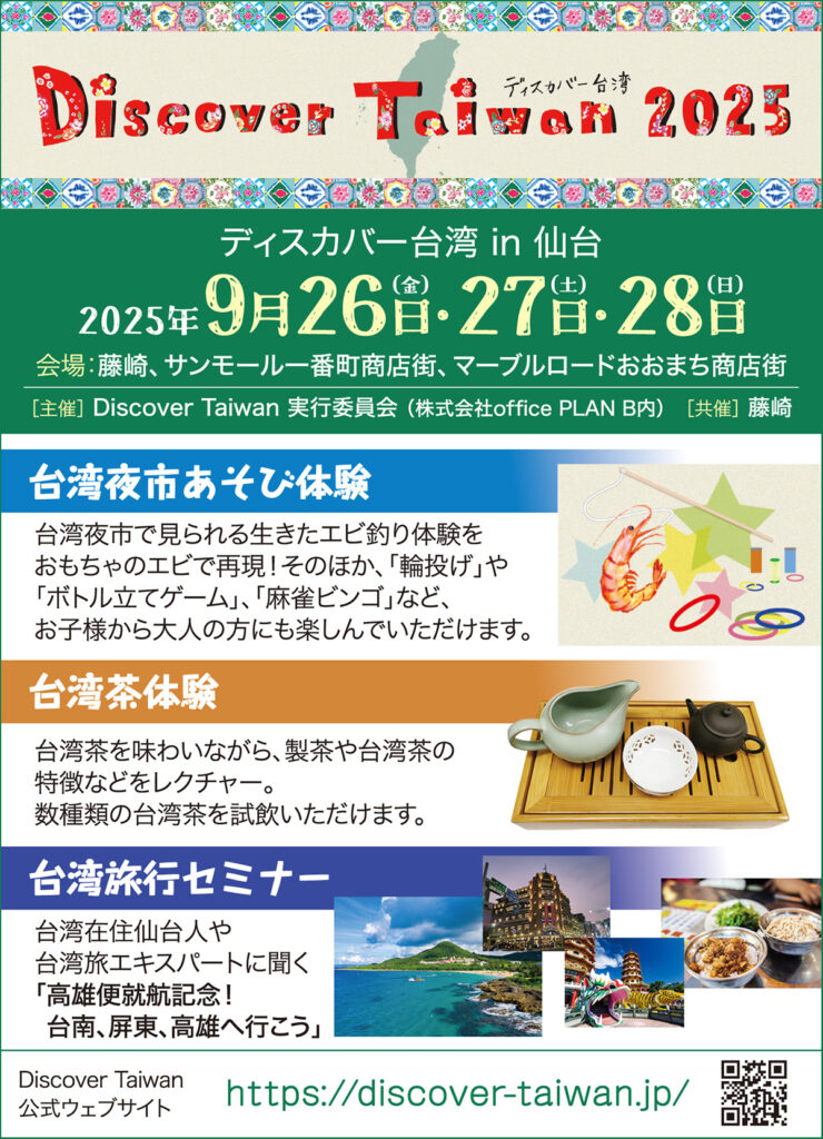 「ディスカバー台湾 in 仙台」では、台湾夜市あそび体験や台湾茶体験、台湾旅行セミナーなどを開催。盛りだくさんの内容で、台湾の魅力をたっぷり味わえるのはもちろん、海外旅行をより身近に感じられるひとときになりそうです。