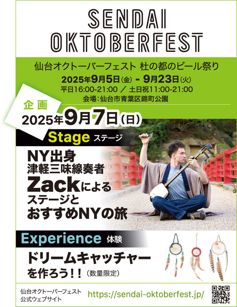 「仙台オクトーバーフェスト」では、ニューヨーク出身の津軽三味線奏者・Zackによるステージと、おすすめのニューヨーク旅行プランを紹介。ブースではガチャガチャ企画のほか、ドリームキャッチャー作り体験も楽しめます。