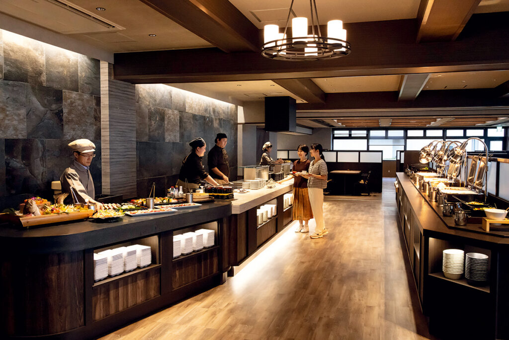 ダイニングでは、地元食材を使った料理がライブキッチンから次々と並び、できたてを楽しめる