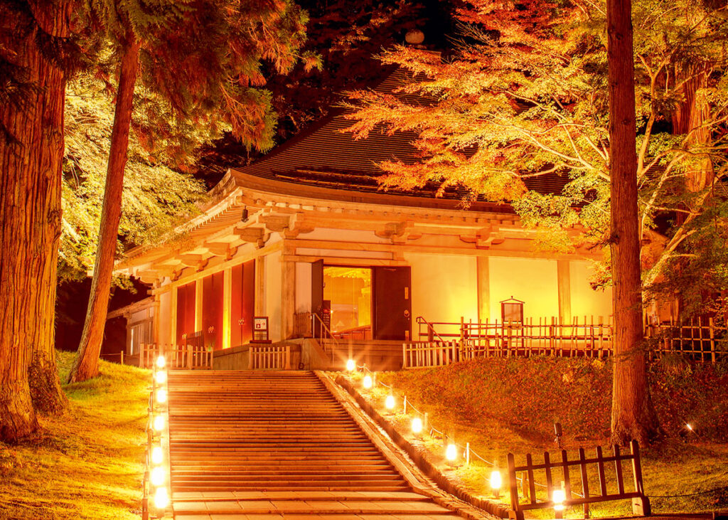 『中尊寺』境内をライトアップする「紅葉銀河」は10月25日~11月9日の夜間に開催。ヤマモミジが色づく参道など見所がたくさん
