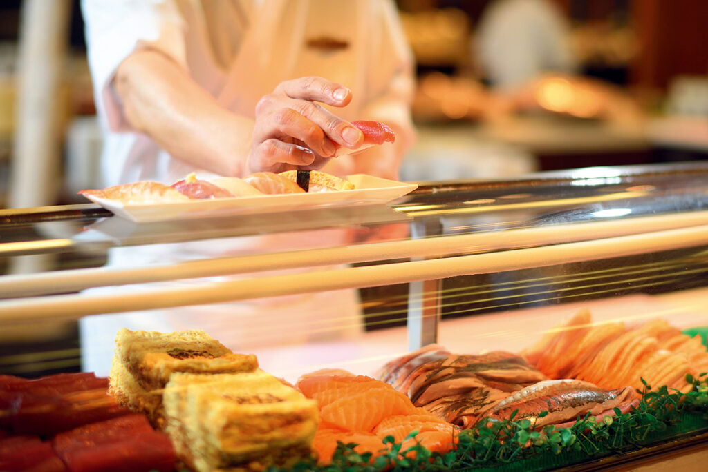 目の前で寿司や天ぷらを仕上げてくれるライブ感あるビュッフェが好評