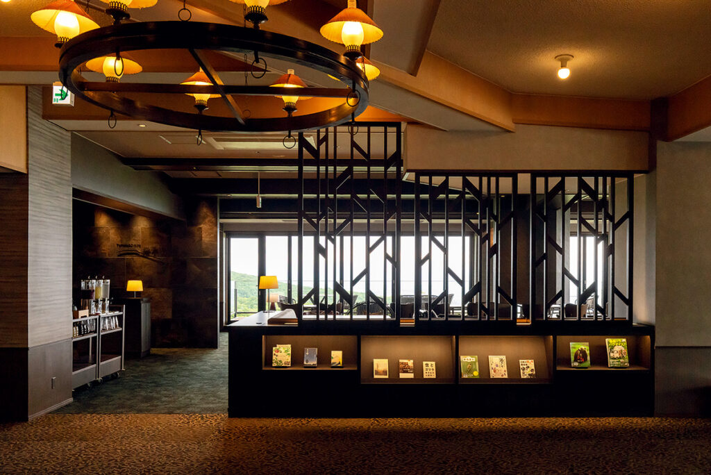 入口のブックシェルフに並ぶのは、雫石町立図書館の司書がこのホテルの立地等を考えて厳選した16冊。本は3ヶ月ごとに入れ替え