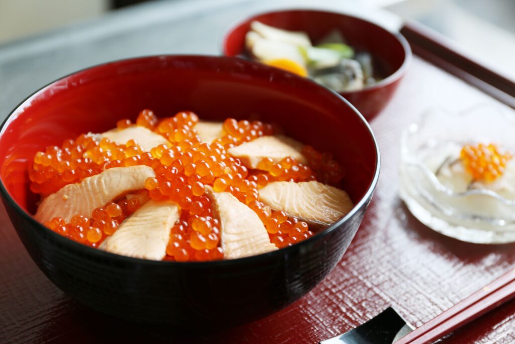 亘理町発祥の秋グルメ「はらこめし」は、秋鮭の煮汁で炊いたごはんに、鮭の身とピカピカのはらこ(イクラ)をのせた風物詩。