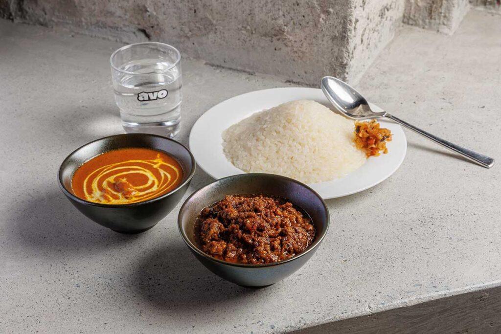 カレーは、キーマとチキンの2種がけ「スパイスカレー ダブル」(1,300円)が人気で、華やかなスパイスの香りと、深みのある味わいが口いっぱいに広がります。そして、三角の山のようにこんもりと美しく盛られたバターライスはなんと、おかわり無料という気風の良さ!