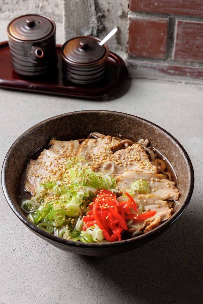 豚バラのとろとろチャーシューがたっぷりの「ねぎチャーシューそば」(1,300円)。紅ショウガもポイント