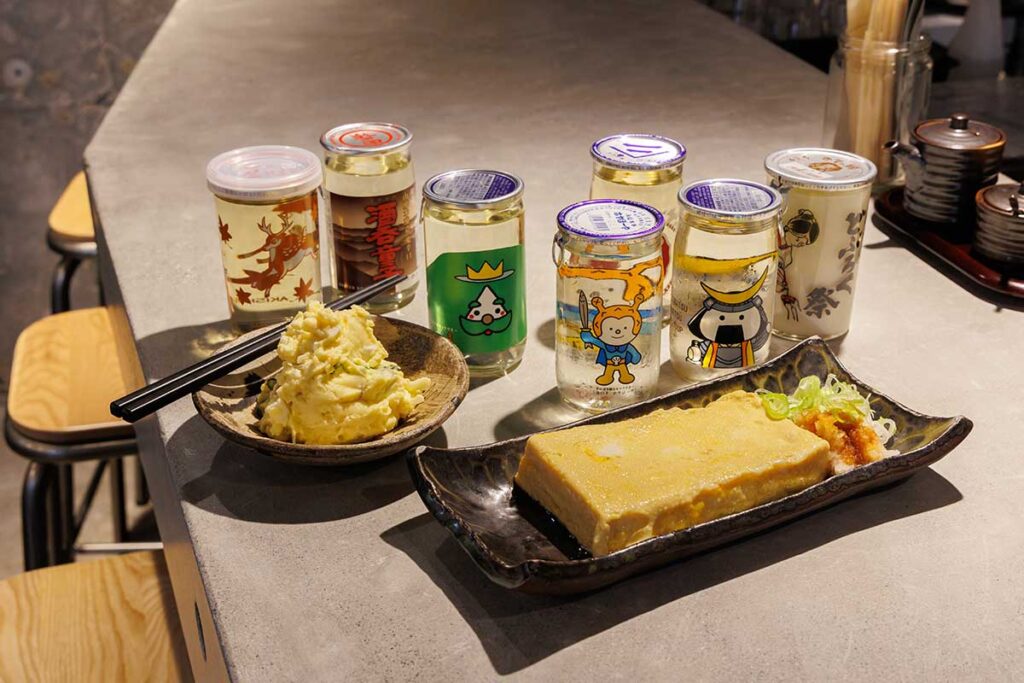 ふわっふわのだし巻き玉子、天ぷら、女将さんのポテトサラダといった居酒屋料理は、やさしい味わい。冷やしトマトや梅水晶、たこわさなど、ちょっとしたアテも豊富なんです。そして、宮城のご当地キャラが描かれたかわいいカップ酒や、クラフトビールも充実していますよ。