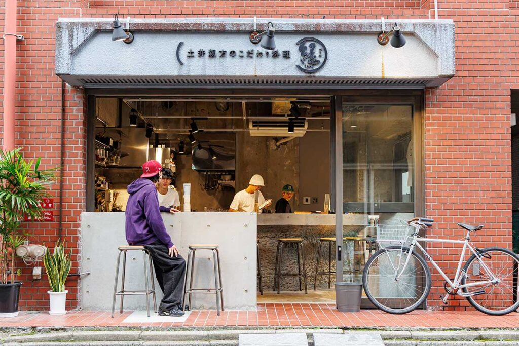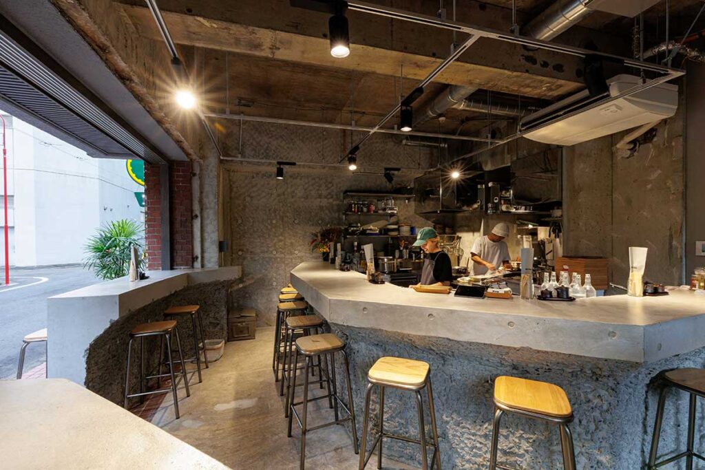 コンクリート打ちっぱなしのクールな空間にはカウンター席が設えられ、キッチンで料理をする夫妻と会話を交わしたり、自分時間にひたったり、肩ひじ張らずに過ごせる雰囲気が魅力です。