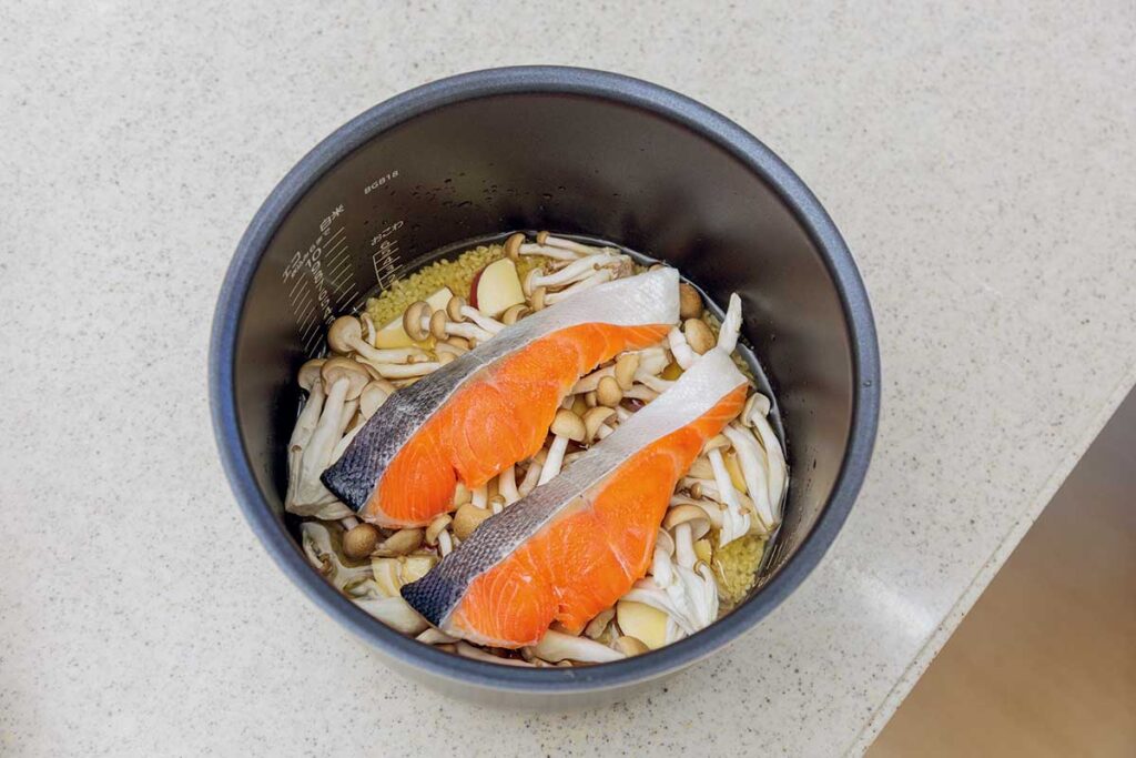 ❸炊飯器に米とAを入れた後に、2合まで水を入れる。水を切ったさつまいも、しめじを入れ、その上に①の鮭をのせて炊く(※1)。