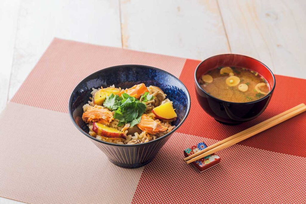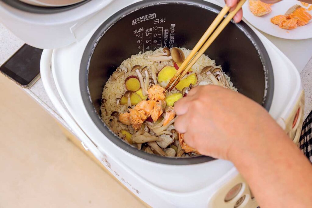 鮭にさつまいも、しめじを一緒に炊き込むことで、