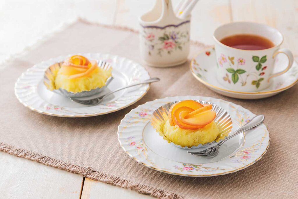 ❹③を4等分にしてラップで丸め、アルミカップにのせ真ん中をへこませる。バラりんごをスイートポテトの中央にのせたらでき上がり。