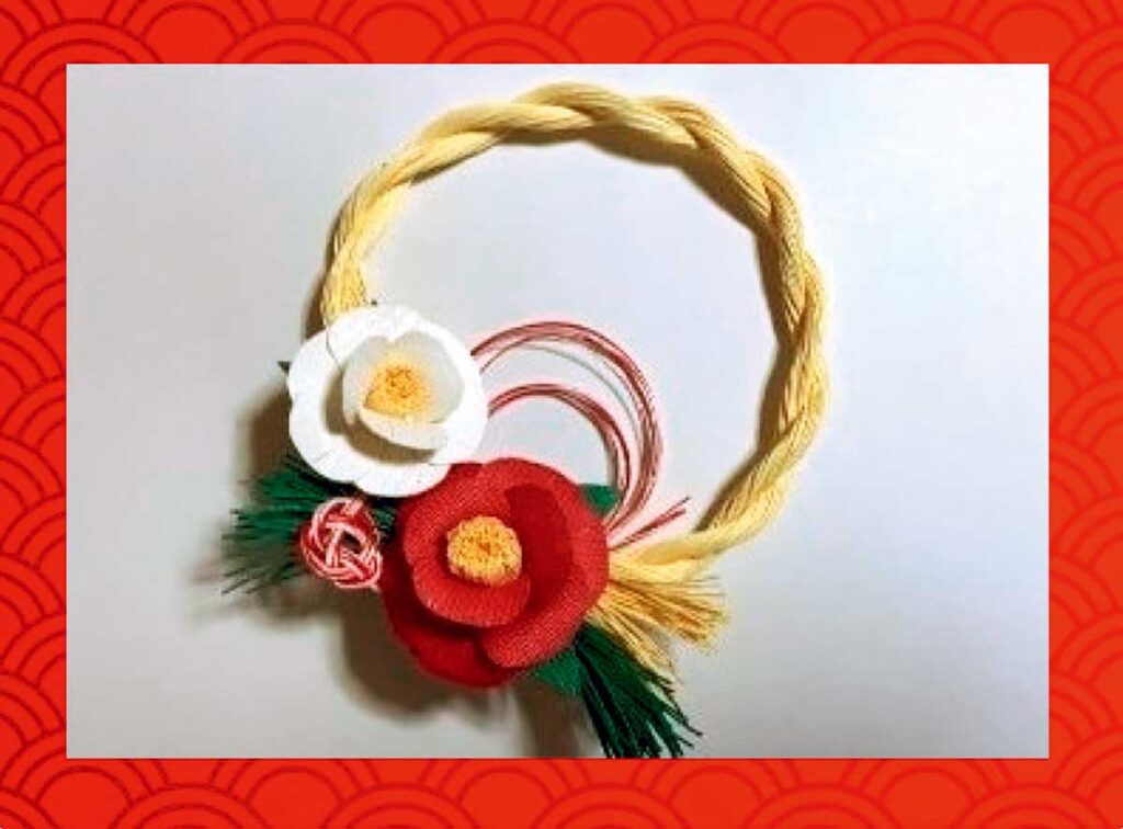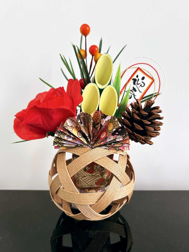クラフトバンドで台座を作り、門松を中心に飾り付けをします。かわいいアレンジでお正月を迎えましょう。