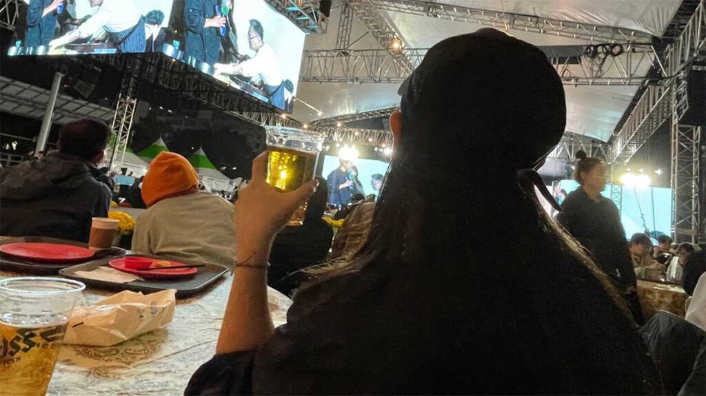 ステージ前の広場では沢山のテーブルとイスが用意されてあり、おいしい料理を食べながらステージプログラムを楽しめます。