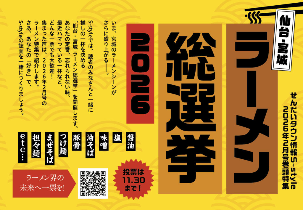 S-styleが開催する、「仙台・宮城ラーメン総選挙」。2年ぶり4回目の人気企画です。