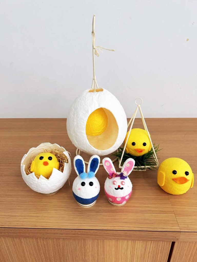 紙張り子でかわいい卵、ひよこ、うさぎを作ります。お部屋や玄関に飾り、春の訪れを楽しみましょう。