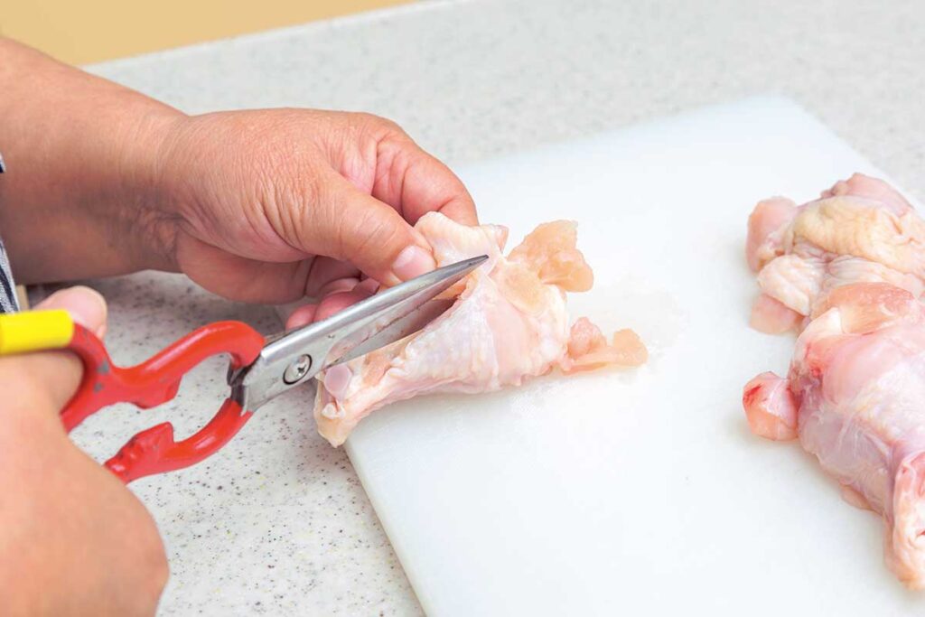 ❶手羽元は皮目の反対方向から骨に沿ってハサミで切り、手で開いておく(※1)。