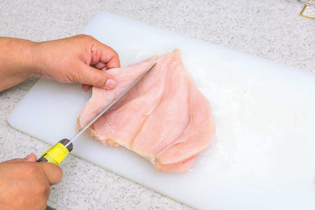 ❶むね肉は厚さが均等になるように肉面に切り込みを入れて開く(※1)。