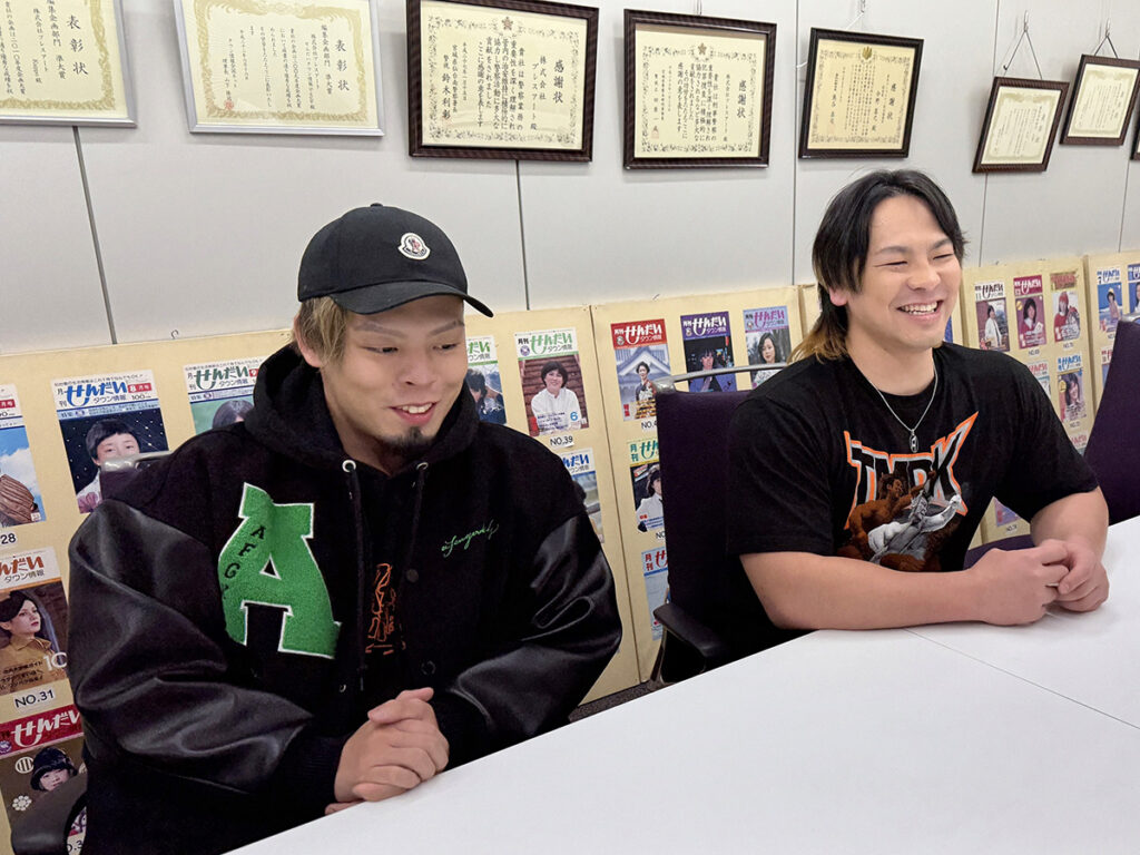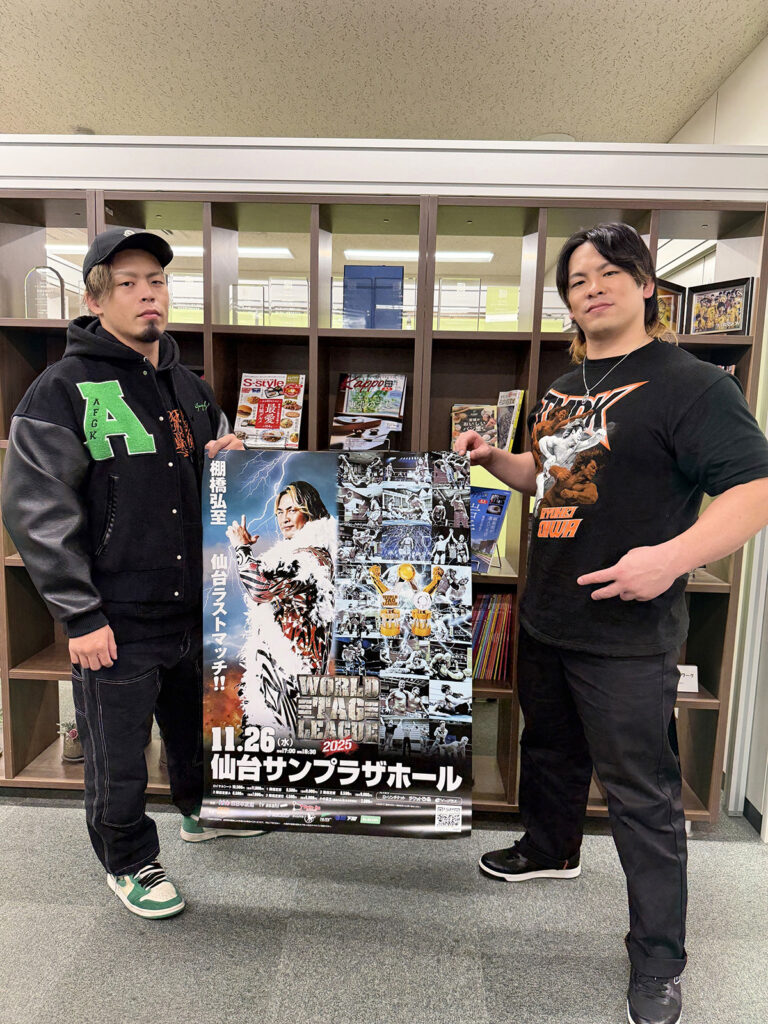 巷ではインフルエンザも流行していますが、みなさん体調管理は万全ですか?風邪をひいている暇はありませんよ!まもなく「新日本プロレス」恒例ヘビー級タッグリーグシリーズの開幕です。今回は、11月26日(水)に開催される仙台サンプラザ大会のプロモーションで、大岩陵平選手と藤田晃生選手が仙台に来てくれました。引退まで50を切った“100年に一人の逸材”棚橋弘至選手最後の仙台大会ということで注目が集まる今大会の見どころや、お二人の入門当時の生活などたっぷり伺いました。記事の最後には、ダブルネームの「サイン色紙」プレゼントの情報もあるのでお見逃しなく!