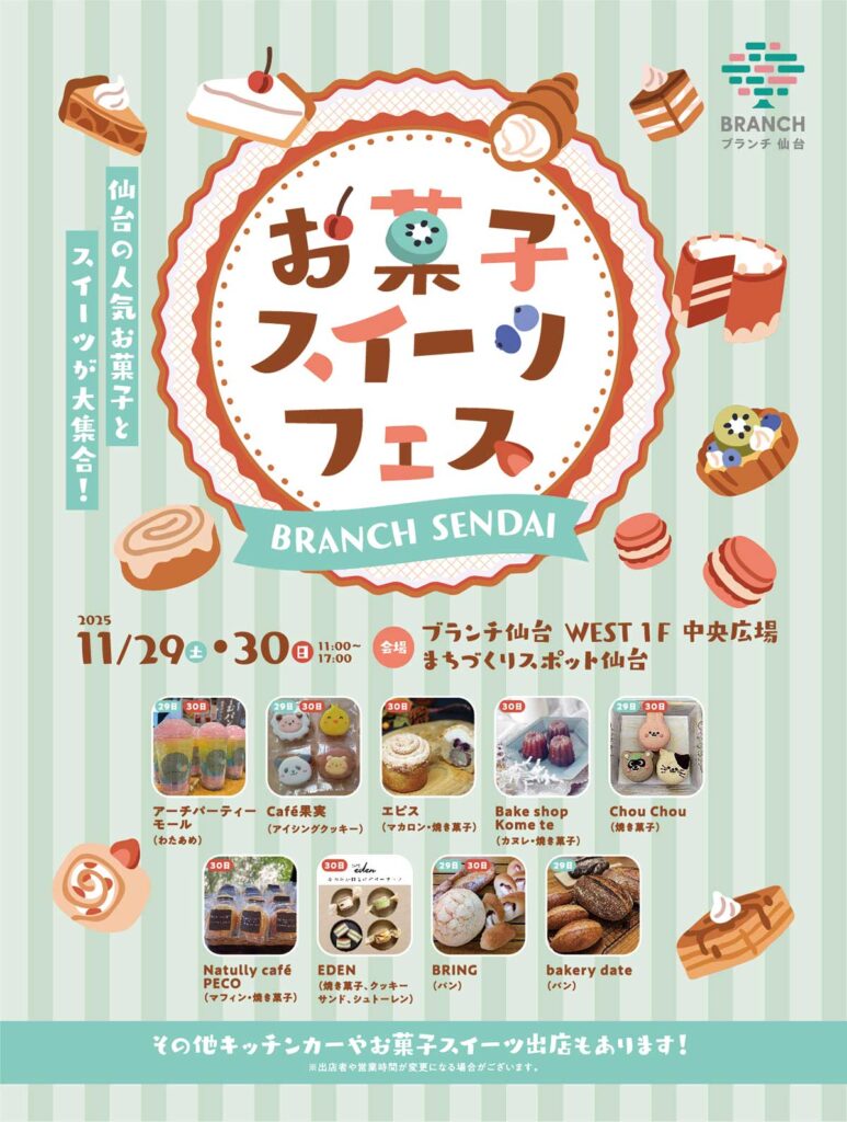 11月29日(土)、30日(日)の2日間、仙台市泉区にあるショッピング施設「ブランチ仙台」で「お菓子スイーツフェス」が開催されます。仙台市内の人気お菓子とスイーツが大集合。当日はキッチンカーのベーカリーの出店もあるので、スイーツ&グルメ好きに嬉しい2日間になりそう!