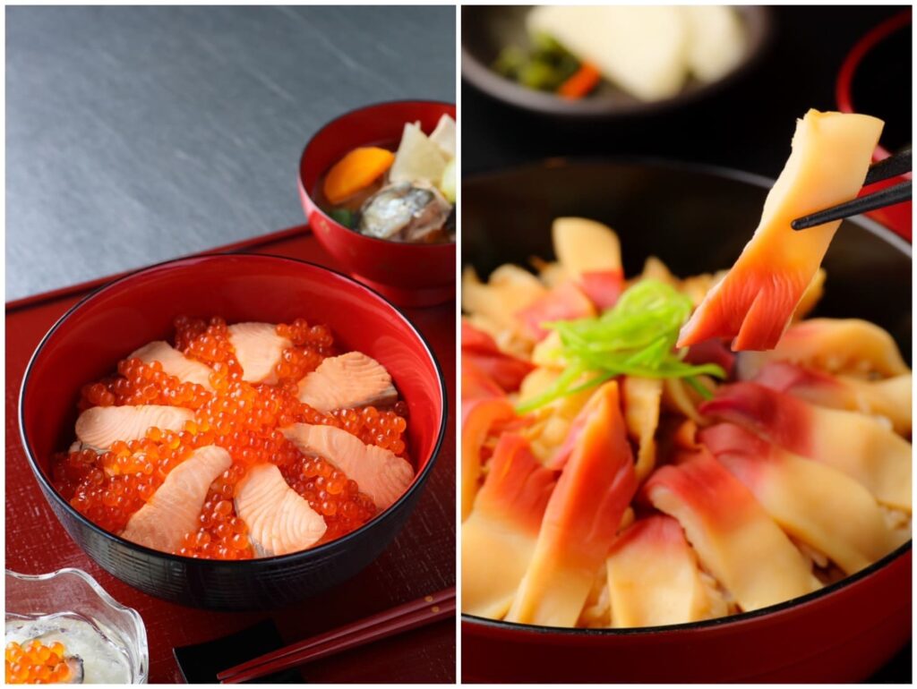 鮭といくらを贅沢にのせた亘理・山元の代表的な郷土料理「はらこめし」。これからの時季は、ほっきの旨みたっぷりの「ほっき飯」