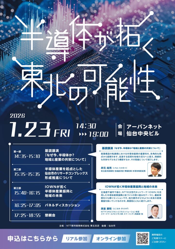 世界的に重要性が高まる「半導体」をテーマに、地域と産業の未来を考えるシンポジウム「半導体が拓く東北の可能性」が、2026年1月23日(金)にアーバンネット仙台中央ビルで開催されます!