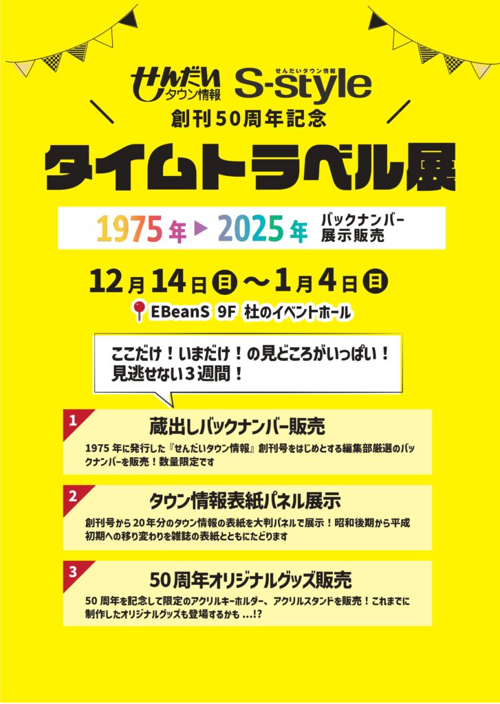 創刊50周年を迎えた『せんだいタウン情報S-style』は、半世紀の歩みをふり返る特別企画 「せんだいタウン情報S-style タイムトラベル展」 を開催します。会場は仙台駅前の商業施設『EBeanS(イービーンズ)』9F「杜のイベントホール」。懐かしい誌面を通して、その時代ごとの街の雰囲気を感じられる内容です。
