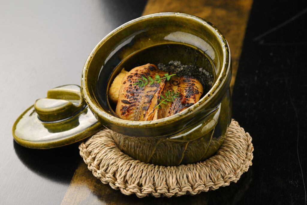 「対馬産煮穴子とだし巻きの土鍋ご飯」(2,960円)。ふっくら煮た穴子と、出汁をたっぷり吸っただし巻き卵が主役の名物メニュー。蓋を開けた瞬間に立ちのぼる香りもごちそうで、シェアして楽しみたい〆の一品!