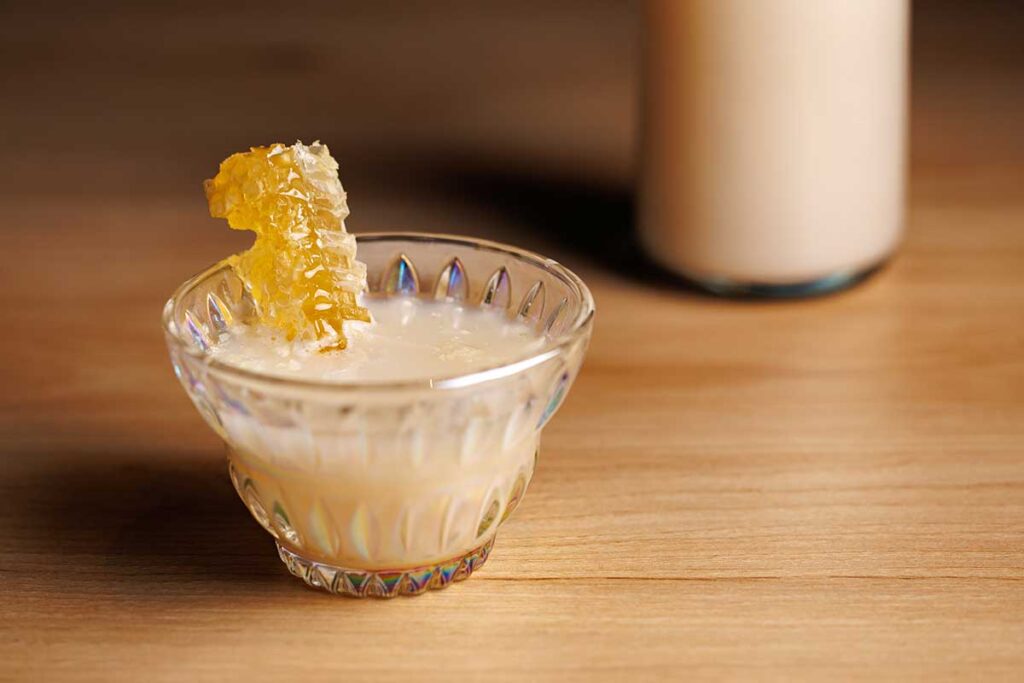 インスタ映え抜群と話題のハチミツの塊が入ったグラスに注がれたマッコリ。