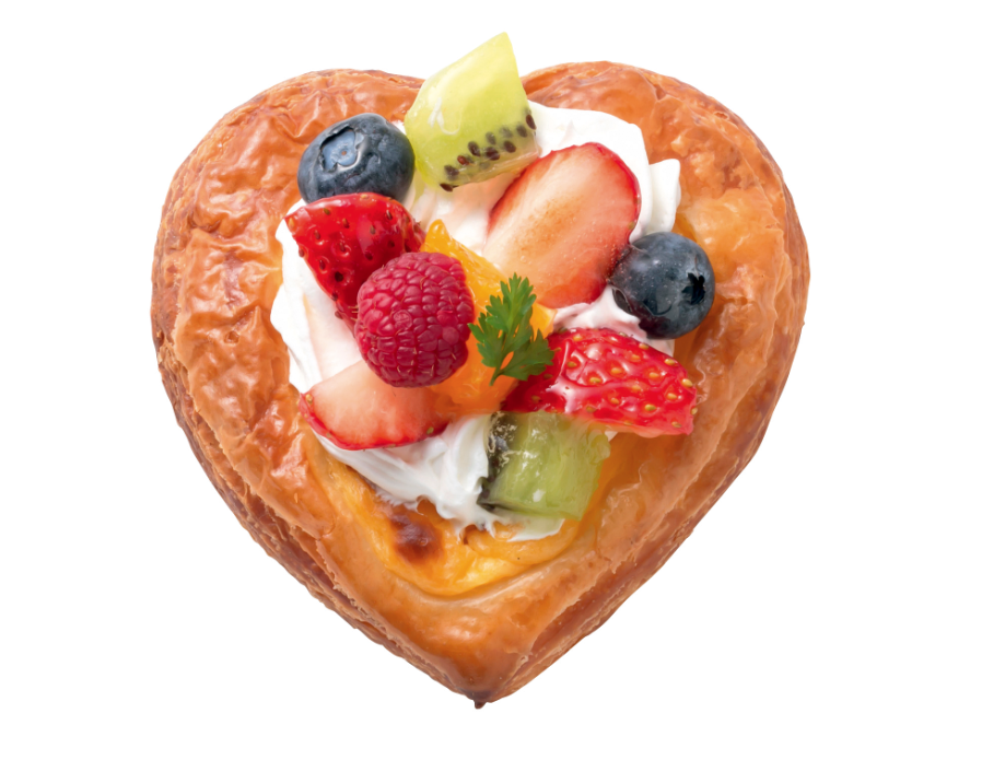 「ミックスフルーツデニッシュ」(410円)。ハート型のデニッシュ生地に、生クリーム&カスタードクリーム、みずみずしいフルーツをのせた可愛らしい看板商品