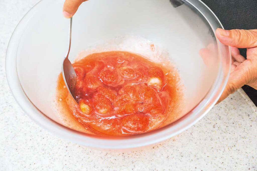 ❶いちご(200g)のヘタを取り縦2等分(大きいいちごは4等分)にし、Aと合わせ耐熱容器に入れレンジ600wで3分加熱する。加熱後一度取り出してスプーンで全体を軽く混ぜ、さらに2分レンジで加熱する(※1)。
