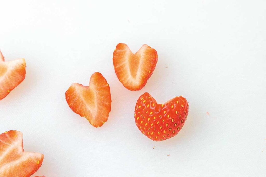 ❷いちごのヘタを切り落としV字に切り込みを入れて縦に半分に切りハート型のいちごを飾り用に作っておく(※2)。