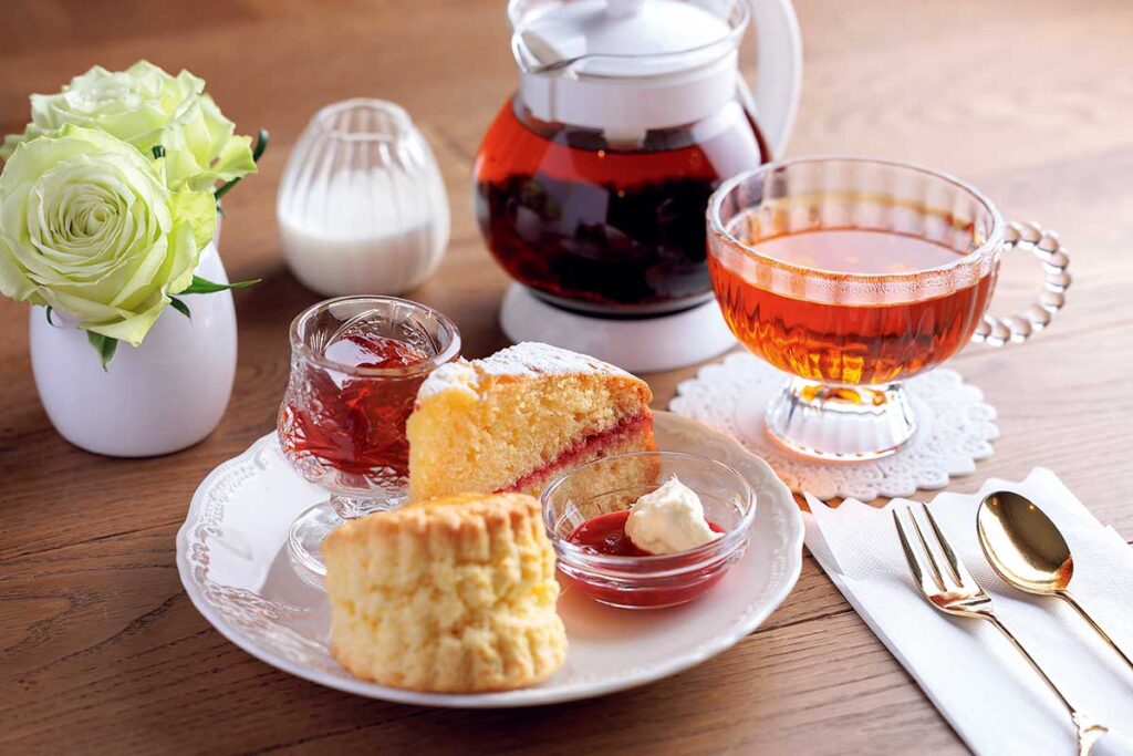 人気の「Teatime set」(1,760円)は、スコーン、ケーキ、ゼリー、クロテッドクリーム&ジャムとポットの紅茶がセット。