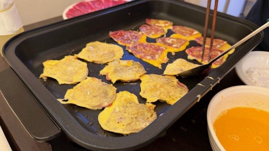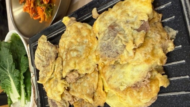薄く切った牛肉に衣をつけて焼く韓国の伝統料理『전(ジョン-チヂミ-)』の一種です。