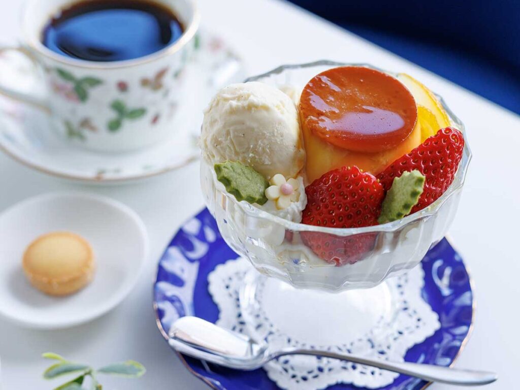 おすすめは、手作りのプリンやシフォンケーキを盛り込んだ「ご褒美プリンパフェ」(900円)。やさしい甘さのプリンを主役にした満足感のある一杯で、コーヒーとの相性も抜群です。