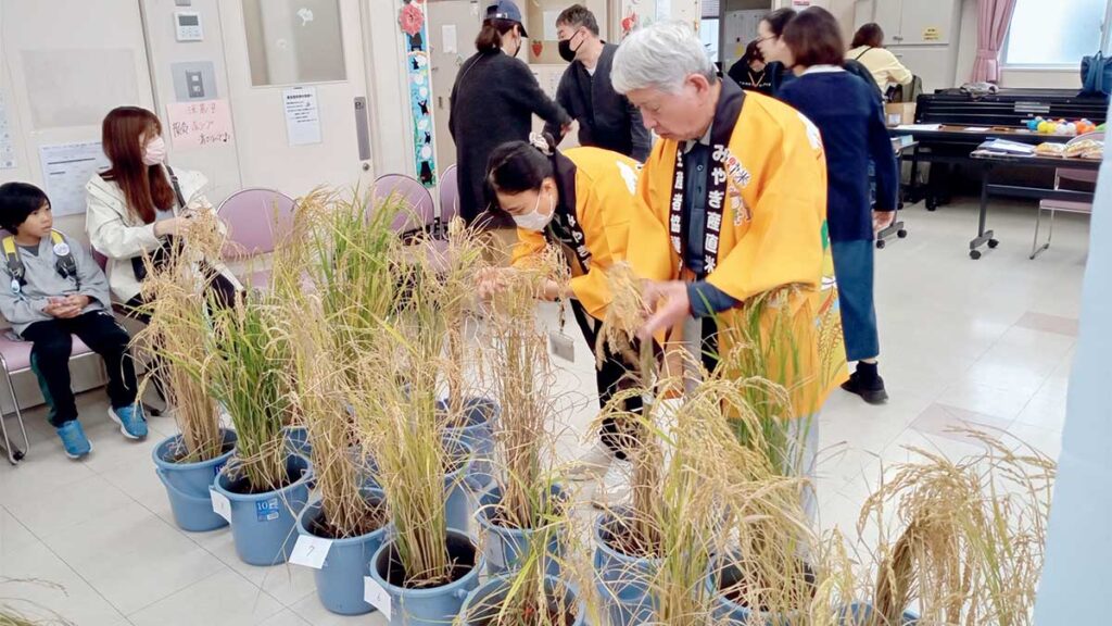 生産者がバケツ稲の育て方を説明(30分程度)。10月10日(土)に栽培した稲のコンテストを開催します。